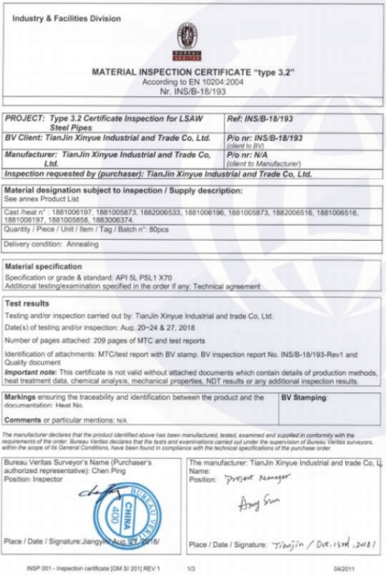 三方检验内容: 签发EN10204/3.2证书